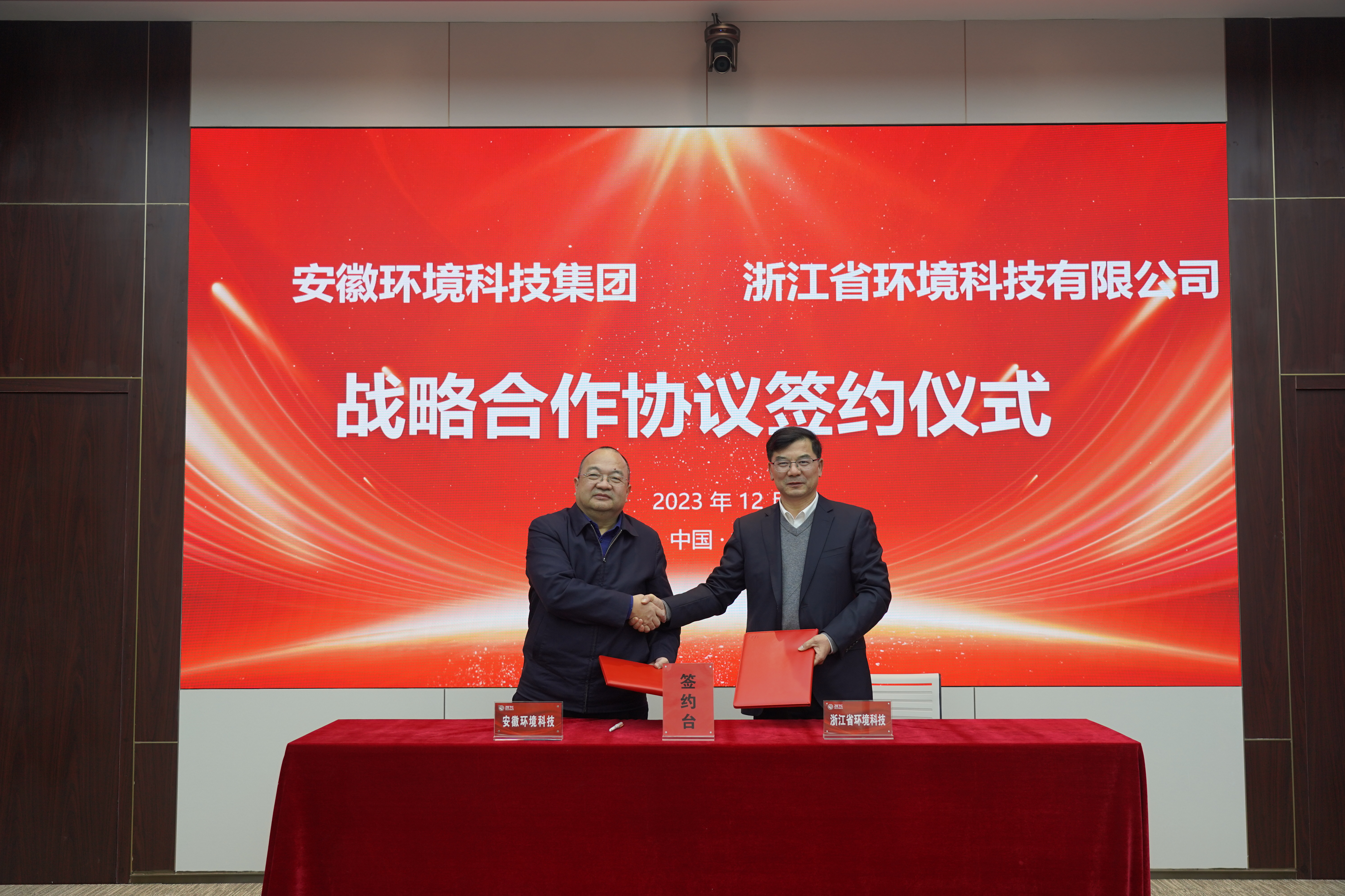 浙江省环境科技有限公司党委书记、董事长韦彦斐,安徽环境科技ag亚娱官方网站入口党委书记、董事长方降龙代表双方签订战略合作协议。