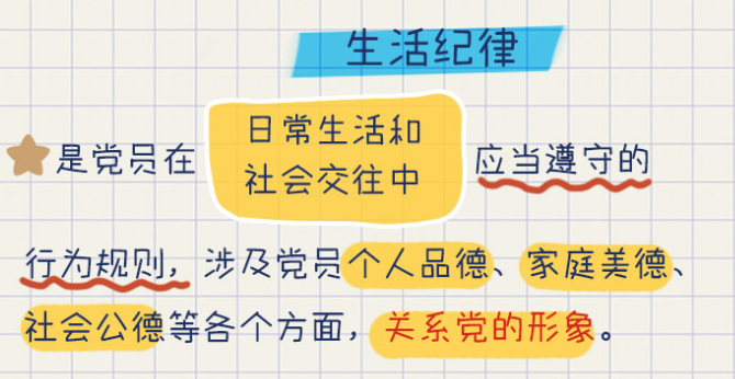 对党员日常活动和社会交往进行规范而制定的行为规则,就是党的生活纪律。与政治纪律、群众纪律、工作纪律等相比,生活纪律所规范的行为,具有一定的私人性和隐秘性,党员干部在生活上的违纪违规行为一旦发生,极易在新媒体条件下被放大,产生非常恶劣的影响。所以,划定生活纪律红线是非常必要的。