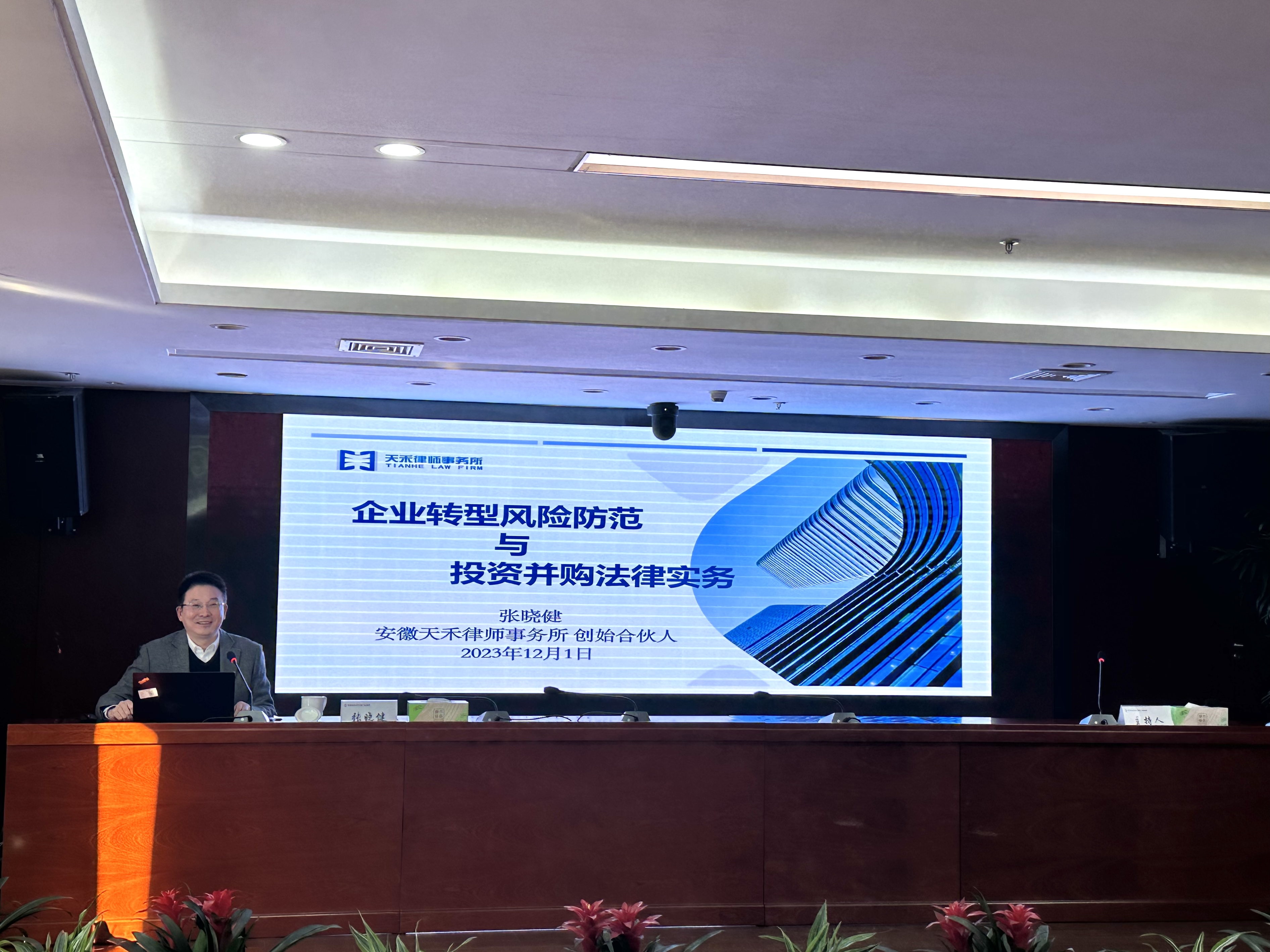 培训旨在弘扬宪法精神、培养员工合规管理意识、推动ag亚娱官方网站入口强化对投资并购问题集中领域的管控,防范和减少相关风险。安徽省人民政府法律顾问、安徽天禾律师事务所创始合伙人张晓健以“企业转型风险防范与投资并购法律实务”为题展开专题讲座。