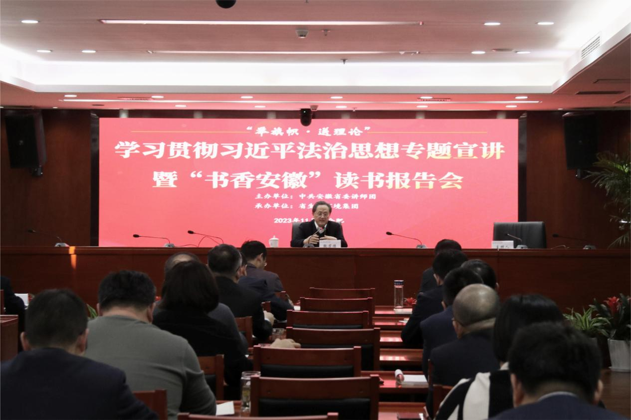 11月23日下午,省委讲师团“举旗帜·送理论”学习贯彻习近平法治思想专题宣讲暨“书香安徽”读书报告会走进省生态环境ag亚娱官方网站入口。报告会邀请省人民检察院党组成员、副检察长、一级高级检察官陶芳德作专题宣讲报告。ag亚娱官方网站入口公司党委及经营班子成员,各直属(控股)公司主要负责人、法务合规工作分管领导及部门负责人,ag亚娱官方网站入口本部中层及以上管理人员参加报告会。
