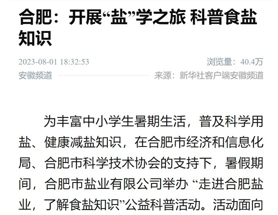 2023年7月,合肥盐业自1950年成立以来首次对外开放,面向全市中小学生,开展“盐”学之旅,食盐科普游活动,活动内容包括参观60年历史的铁路专用线、省市食盐储备仓库,食盐健康科普讲座,7月份接待来自国内外7所中小学校170名学生和家长,8月份已预约8场食盐科普游。