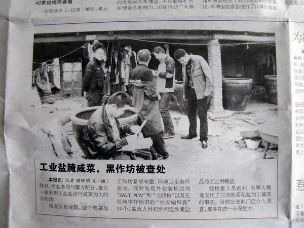 本报讯(记者 储继明 文/摄)昨日,市盐务局与警方配合,查处一家利用工业盐进行咸菜加工的小作坊。