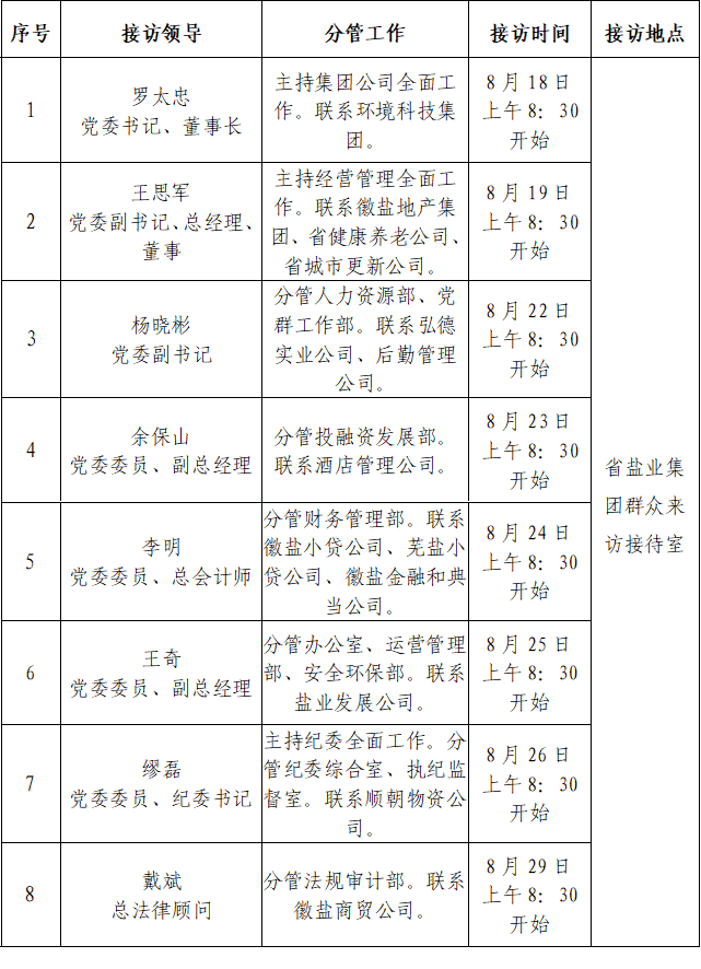 根据工作安排,现就省盐业ag亚娱官方网站入口领导班子成员8月份接待省盐业系统职工群众来访安排公示如下: