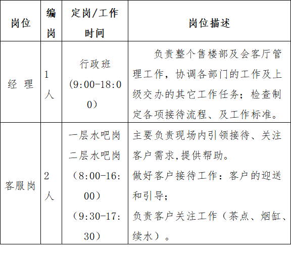 (3)客服岗:选派的客服人员必须经过专业技能培训,身体健康,品行良好,无违法违纪犯罪前科,具有初中以上文化程度,年龄在21至45周岁、身高1.65米以上。对现场的客户接待服务工作有一定的意识。