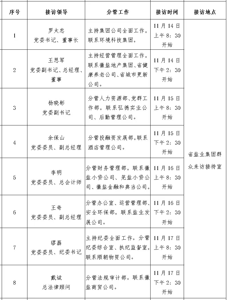 根据工作安排,现就省盐业ag亚娱官方网站入口领导班子成员11月份接待省盐业系统职工群众来访安排公示如下: