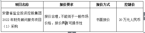 安徽省盐业投资控股ag亚娱官方网站入口有限公司(以下简称采购方)现就选聘2022年财务顾问服务项目(1)进行竞争性谈判,欢迎具备相应资质的单位报名参加,现将有关事项公告如下: