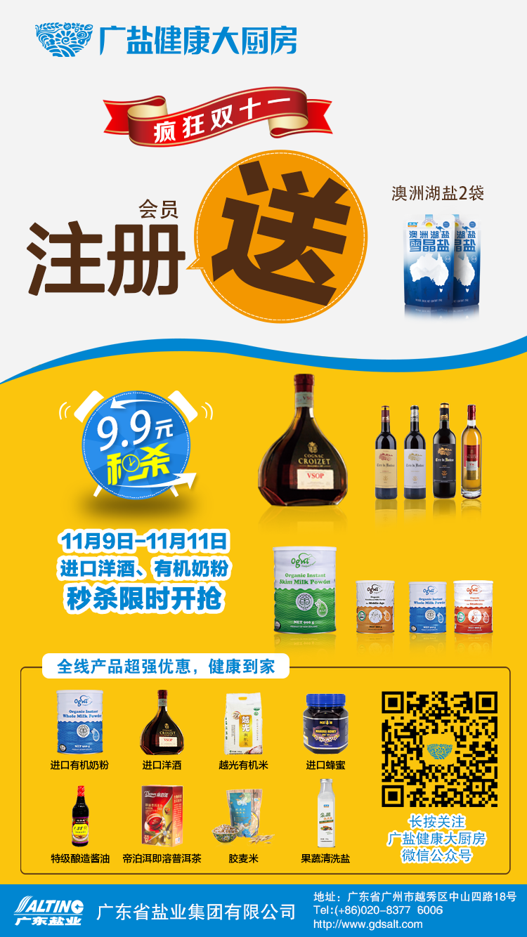 广东省盐业ag亚娱官方网站入口在11月组织开展全省统一的广盐健康大厨房“双11” 营销活动。活动期间,用户关注“广盐健康大厨房”微信公众号(微信号:gyjkdcf)并注册为会员的,每人均可免费获赠两包澳洲湖盐(250g),另外还有多款商品限时“9.9元秒杀”及全场打折优惠活动,活动详情及参与方式请大家关注广盐健康大厨房。