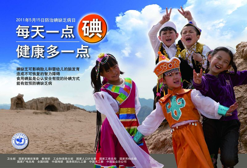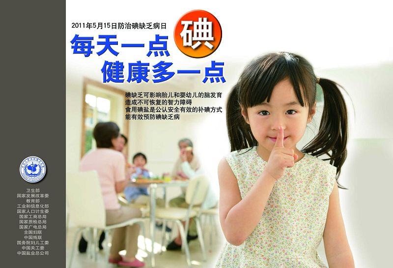 2011年碘缺乏病防治海报使用说明: 2011年防治碘缺乏日宣传海报(家庭版、西部版)的印刷电子版,是使用Photoshop软件制作的分层文件,分辨率为300像素点,成品尺寸为570 mm×840mm。各地可根据宣传需求适当调整并印刷使用。 该平面海报版权归卫生部所有。电子文件内所有图像资料可无偿用于防治碘缺乏宣传教育,但不得用于其他内容的宣传或商业行为。