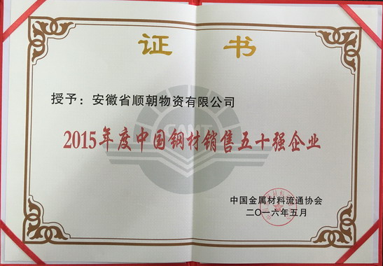 2016年5月27日,第三届中国钢铁产业企业家峰会在山东省滨州市隆重开幕,本次峰会由中国金属材料流通协会和滨州市博兴县人民政府联合主办,来自中国钢铁工业协会、中国施工企业管理协会、中国汽车工业协会等上下游行业协会领导、钢铁生产、流通、终端用户等全产业链企业家近500人出席。会上,安徽顺朝第三次蝉联中国金属材料流通协会授予的“中国钢材销售五十强企业”称号。