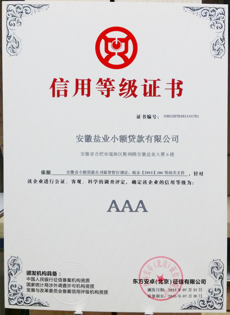 近日,安徽省金融工作办公室公布安徽省小额贷款公司2014年度信用评级结果,徽盐小贷公司连续两年被评定为最高等级AAA级。