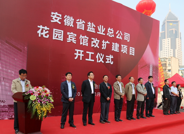 2014年10月18日上午,安徽省花园宾馆改扩建项目在花园宾馆举行隆重的开工奠基仪式,参加仪式的嘉宾有:中共庐阳区委书记吴劲、副书记张家祥,庐阳区副区长李仲生、中建八局四公司董事长周可璋及相关协作单位、省盐业总公司总经理詹先豪,副总经理王良贵、颜宗华、杨晓彬,省公司本部机关处室及直属公司主要负责人。