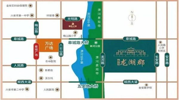 徽盐龙湖郡是徽盐地产进入六安市区后的第四个项目,项目东至六安市长安北路,北至皋城路,西临淠河总干渠,南接城市公园,项目坐拥一线湖岸景观、双城市公园,金安路小学和人民小学东校环伺项目,周边生态环境优美、生活配套完善。