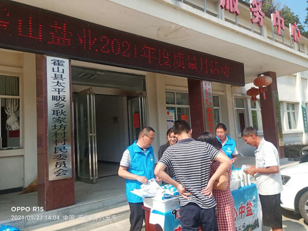 9月27日,霍山县盐业公司利用到太平畈乡耿家坊村扶贫之际,结合盐业发展公司《旺季市场营销宣传工作方案》“四进一参”相关要求,开展了“质量月”主题宣传活动。