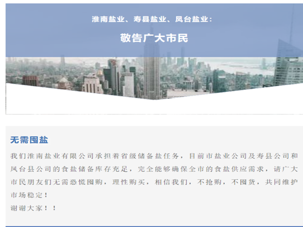 为有效阻止食盐抢购风波蔓延,全省各级盐业公司一方面充分利用微信公众号、地方性媒体、微信朋友圈等线上渠道发布正面宣传信息,另一方面积极组织人员进商超、下市场,通过面对面的宣传形式,引导广大消费者不抢购、不囤货、理性购盐。