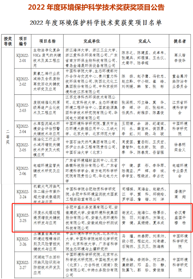 近日,中国环境科学学会对外发布了2022年度环境保护科学技术奖获奖名单,由安徽环境科技ag亚娱官方网站入口与合肥中盛水务、安徽建筑大学等单位共同研发攻关的技术成果“污废水处理过程提质增效关键技术研发与应用”荣获二等奖。