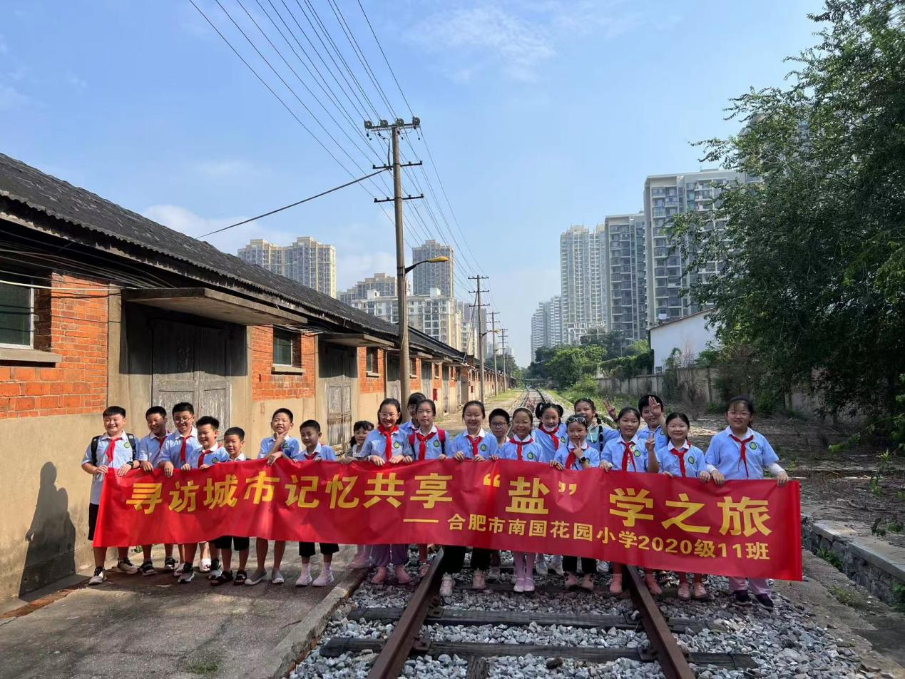 在铁路专用线,同学们听老师讲解,知道合肥人吃的盐都从哪里来,了解铁路专用线的建造和停用背景。