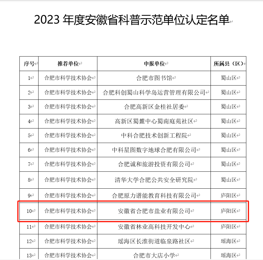 为全面贯彻落实党的二十大精神,切实加强科普能力建设,根据《安徽省全民科学素质行动规划纲要实施方案(2021-2025年)》和《关于开展2023年度安徽省科普示范单位认定工作的通知》(皖科协普秘〔2023〕65号)的部署安排,经设区的市科协和省级学会推荐、专家评审、公示等程序,安徽省科协决定认定安徽省合肥市盐业有限公司为2023年度安徽省科普示范单位,示范期5年。