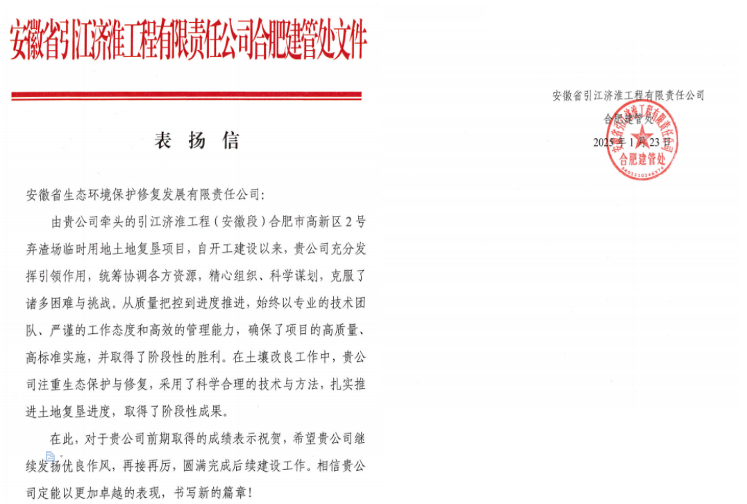 新年的第一封表扬信带着温暖而至,1月23日,安徽省引江济淮工程有限责任公司合肥建管处致表扬信,信中对生态修复公司牵头的引江济淮工程(安徽段)合肥市高新区2号弃渣场临时用地土地复垦项目的建设质量、进度推进以及土壤改良等方面的工作给予充分肯定,对项目部同事的专业素养和工作作风给予高度赞扬。