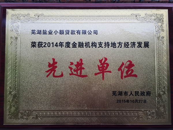 芜湖市2014年金融机构考核中,芜湖盐业小额贷款有限公司荣获芜湖市“金融机构支持地方经济发展先进单位”称号。